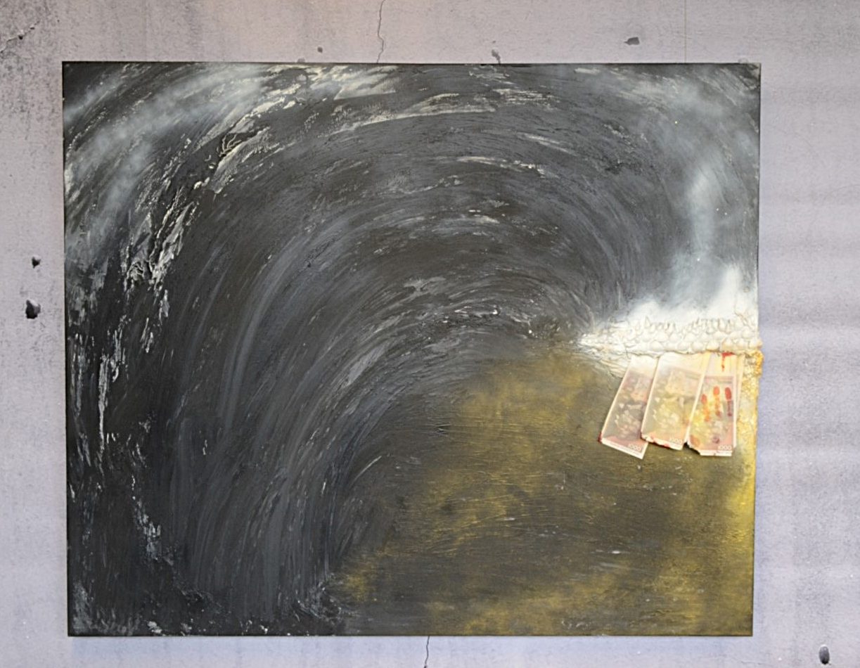 From this corrupted nexus, the painting’s dynamic unfolds. Powerful, grey and white wave-like or cloud-like structures, executed in fluid acrylic techniques, describe a dramatic arc. They sweep in from the left, initially ascending before inexorably curving downwards into the lower-left corner of the canvas. This movement is the work’s compositional statement: it embodies the downward spiral, the inescapable descent that follows every act of insatiable accumulation. The chaos of greed leads inevitably to bankruptcy, an aesthetic portrayal of systemic collapse.