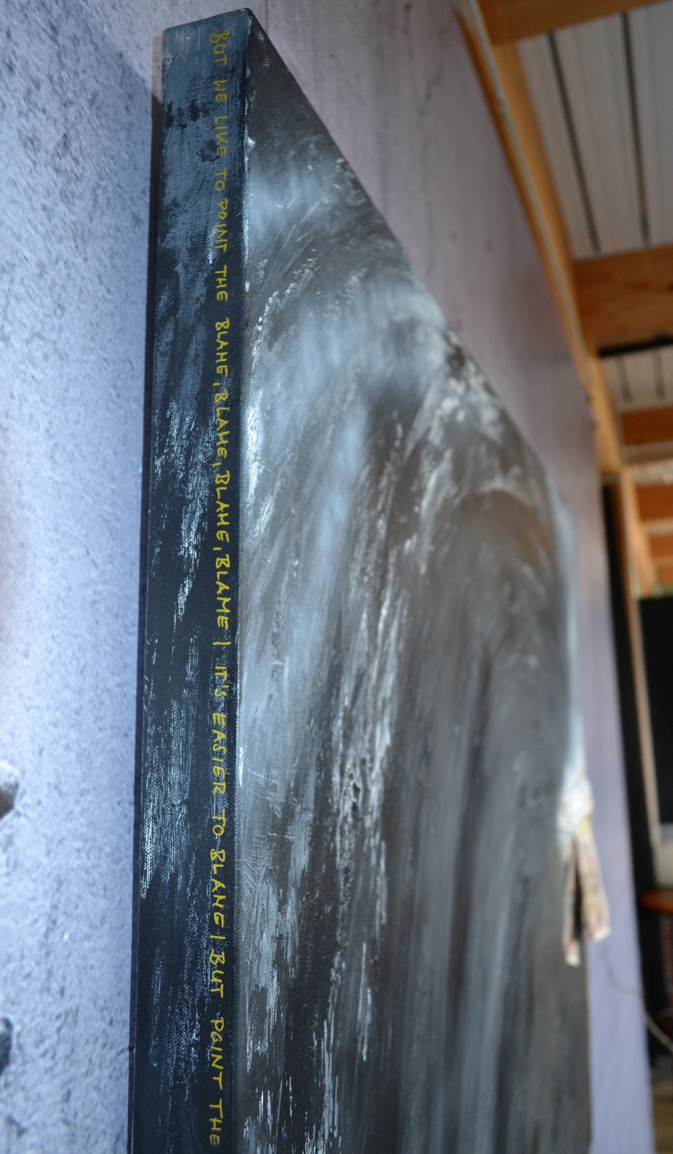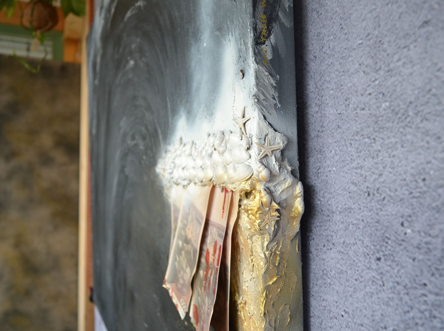 My large-scale, mixed-media painting, a profound interpretation of Ren’s epochal „Money Game Part 2,“ transcends mere visual accompaniment to the music; it is a haptic requiem for greed and its inevitable collapse. In this work, I deliberately retreated from the world’s abundance of color, opting instead for a rigorous palette of greys, whites, and gold. This reduction serves as a metaphorical lens: gold represents the alluring yet ultimately sterile fascination with capital, while grey and white signify the emptiness, decay, and entropy inherent within the system.